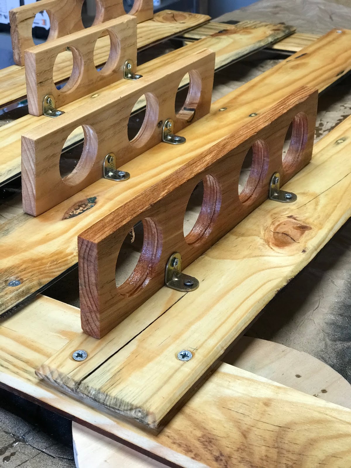 Con dos listones más de palets hice las mini baldas donde irán las macetitas. Utilicé el taladro de columna y una broca de corona para ir haciendo todas las perforacciones. Previamente las pase por mi taladro/lija para quitarles todas las astillas y dejarlas bien suaves.
